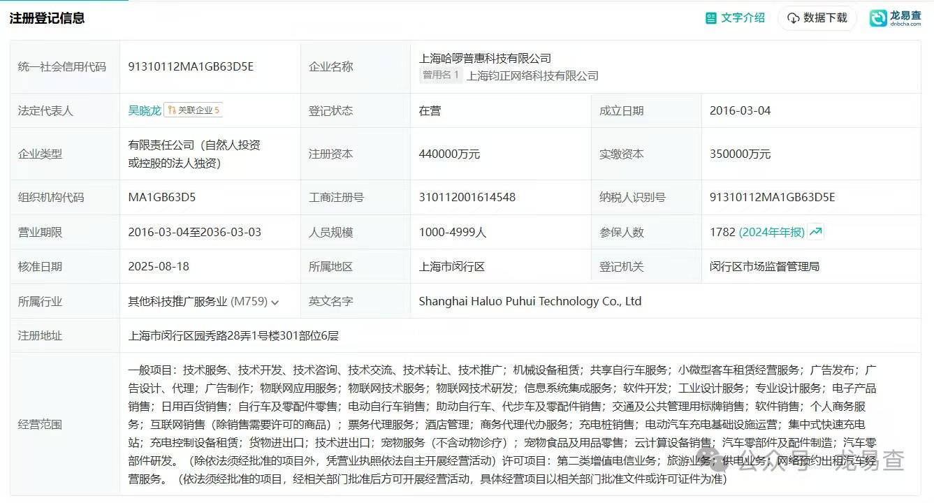 龙易查显示,上海哈啰普惠科技有限公司,成立于2016年,注册资本高达440000万元,参保人数为1782人。